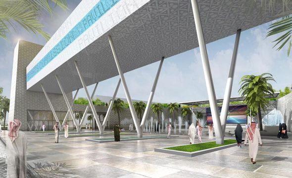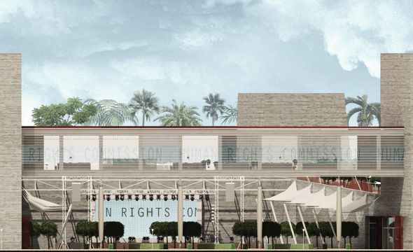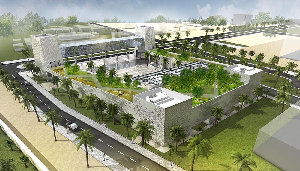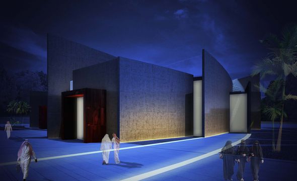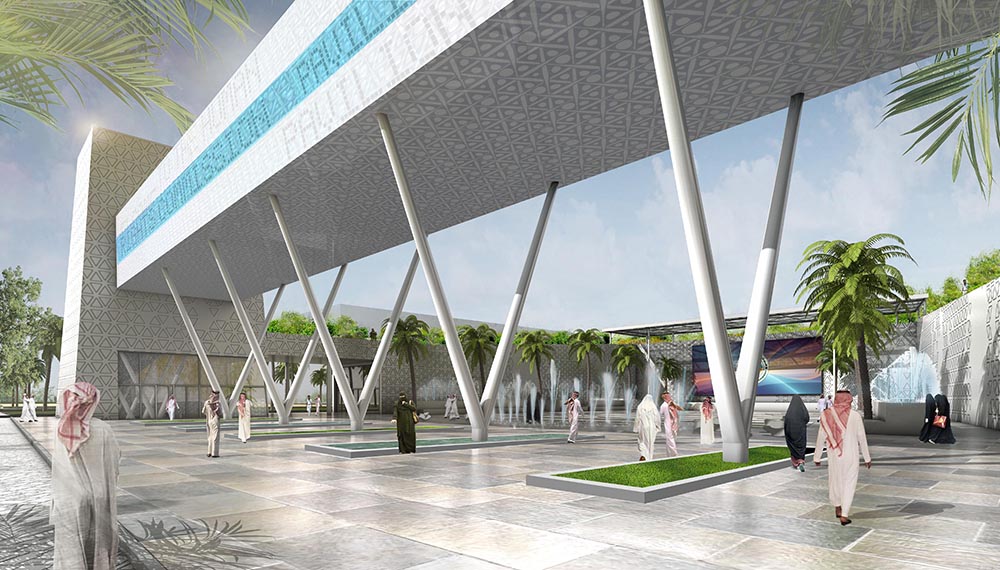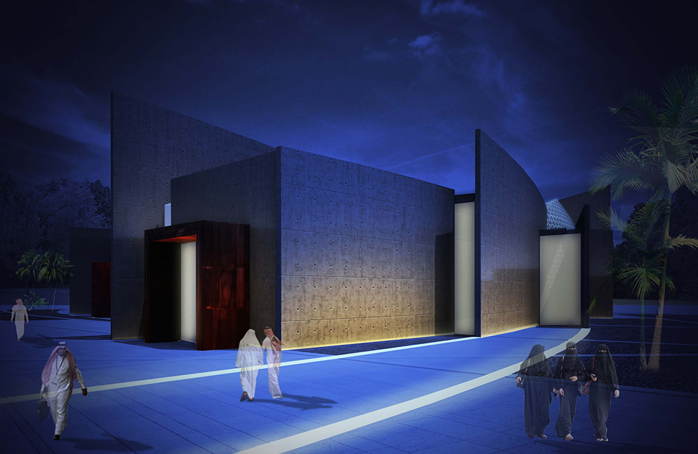 The exhibition concept leads the visitor along ramps, to view along exhibits reflecting the various aspects of Human Rights. The building itself encompasses a strategic use of lighting by interior illumination of filtered natural light by day and glowing with media screen and light features by night. The design hosts a rich organic landscape with water elements and public gardens for repose and contemplation amid the rich Janadriyah Festival.