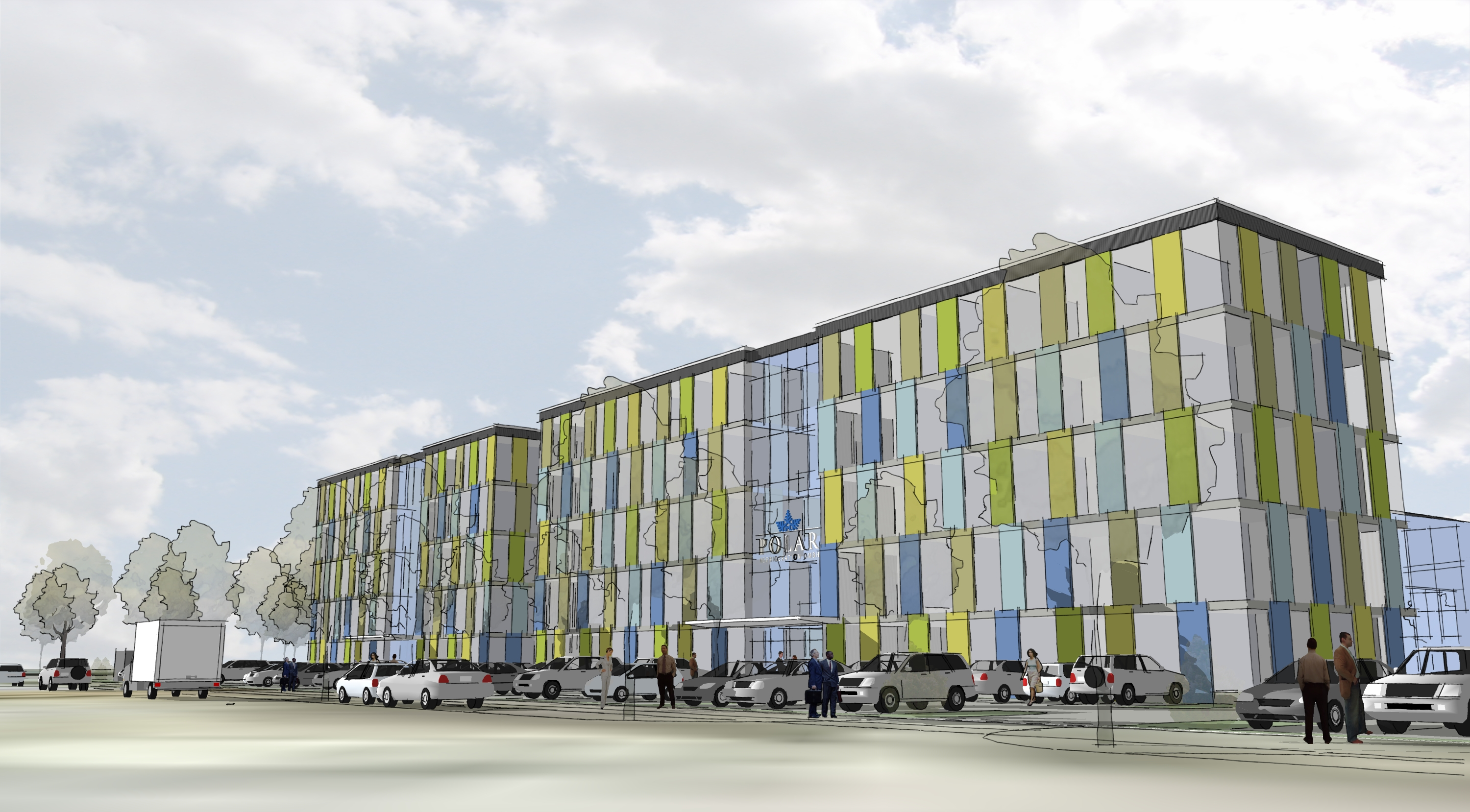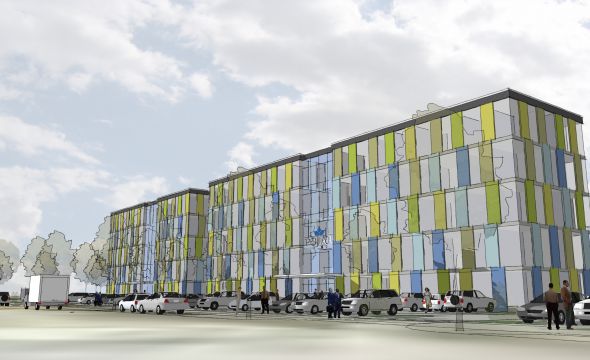 The design utilizes the space to its maximum potential and allows for future additional rental offices, and additionally space for future expansion. The building is broken down into the following intertwined units; a production hall, a social & technical department, offices, loading bays, parking and rentable units. These individual flexible units connect harmonically via centrally located circulation cores and exterior landscaped pathways. Utilization of porous pavings and green rooftops contribute additionally to the site’s green character.The façade greets passersby with a simple visual statement that disguises the functionality of the loading bays and logistic services within the yard. The generous openings allow for beneficial natural light to enter the office units.